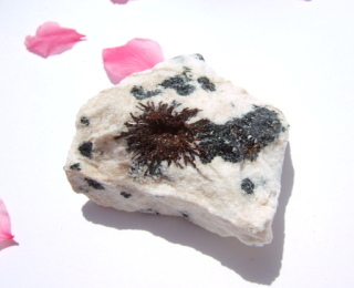 ところどころに針状で艶やかな黒い鉱物、